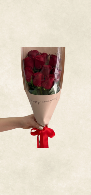 Yaklaşık 50 cm yüksekliğinde buket, 10 adet kırmızı gül ile hazırlanmaktadır.
