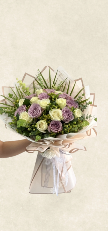 Özenle seçilmiş beyaz ve lila güller ve , buket halinde şık bir ambalaj ve zarif süslemelerle hazırlanır. Özel günler, kutlamalar ve anlamlı anlar için etkileyici ve özgün bir tercih sunar.