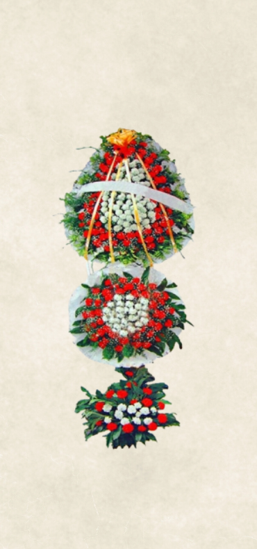 Özenle seçilmiş kırmızı ve beyaz çiçekler , dekoratif ve zarif süslemelerle 3 katlı çelenk için hazırlanır. Özel günler, kutlamalar ve anlamlı anlar için etkileyici ve özgün bir tercih sunar.