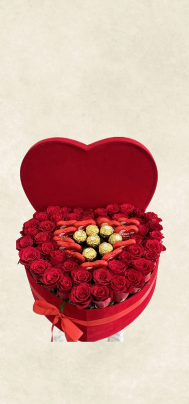 Özenle seçilmiş kırmızı güller ve çikolata , büyük kırmızı kalp kutuda ambalaj ve zarif süslemelerle hazırlanır. Özel günler, kutlamalar ve anlamlı anlar için etkileyici ve özgün bir tercih sunar.