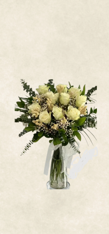 Özenle hazırlanmış aranjman içerisinde ithal beyaz güller ve dekoratif süslemelerle, özel günleriniz için zarif ve şık bir hediye seçeneğidir.