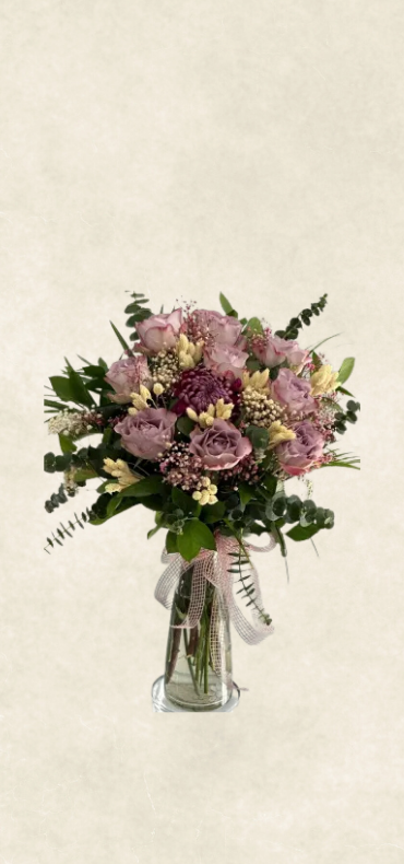 Özenle hazırlanmış aranjman içerisinde ithal lila güller ve dekoratif süslemelerle, özel günleriniz için şık ve zarif bir hediye seçeneğidir.