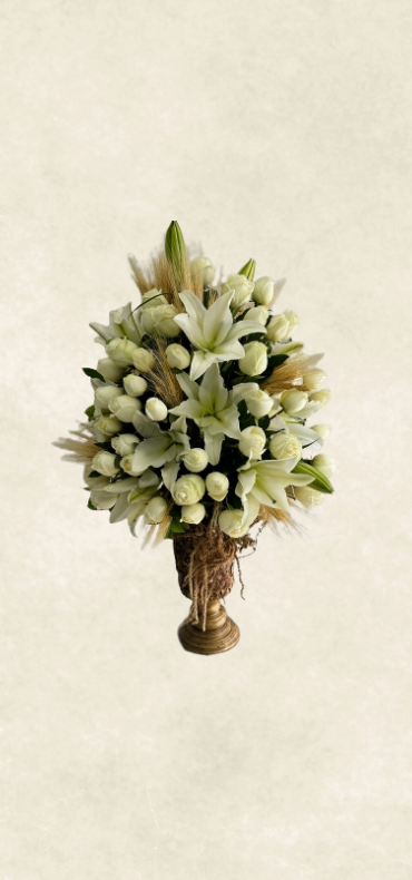 Özenle seçilmiş beyaz güllerle , dekoratif bir kadehte şık bir şekilde hazırlanan ambalaj ve zarif süslemelerle hazırlanır. Özel günler, kutlamalar ve anlamlı anlar için etkileyici ve özgün bir tercih sunar.