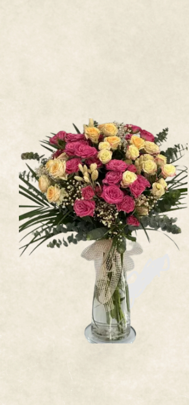 Özenle hazırlanmış aranjman içerisinde çeşitli renklerde dekoratif sprey güller, özel günleriniz ve dekoratif kullanım için şık bir hediye seçeneğidir.