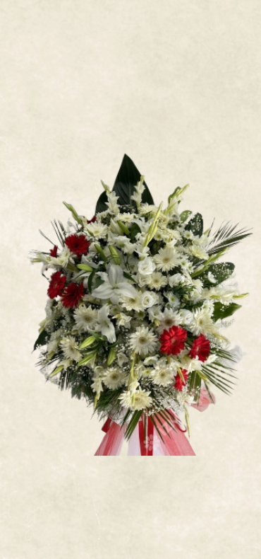 Özenle seçilmiş beyaz ve kırmızı çiçekler , dekoratif ve zarif süslemelerle ferforje için hazırlanır. Özel günler, kutlamalar ve anlamlı anlar için etkileyici ve özgün bir tercih sunar.