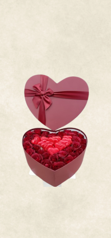 Özenle seçilmiş kırmızı güller ve çikolatalarla şık bir kalp kutuda ambalaj ve zarif süslemelerle hazırlanır. Özel günler, kutlamalar ve anlamlı anlar için etkileyici ve özgün bir tercih sunar.