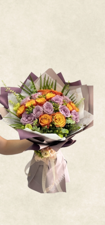 Özenle seçilmiş  lila ve turuncu güller , buket halinde şık bir ambalaj ve zarif süslemelerle hazırlanır. Özel günler, kutlamalar ve anlamlı anlar için etkileyici ve özgün bir tercih sunar.