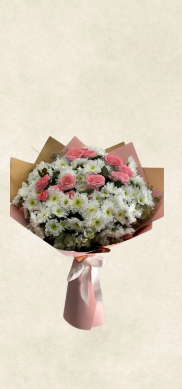 Özenle hazırlanmış buket içerisinde papatya ve sprey güller, dekoratif ambalaj ve süslemelerle özel günleriniz için zarif bir hediye seçeneğidir.