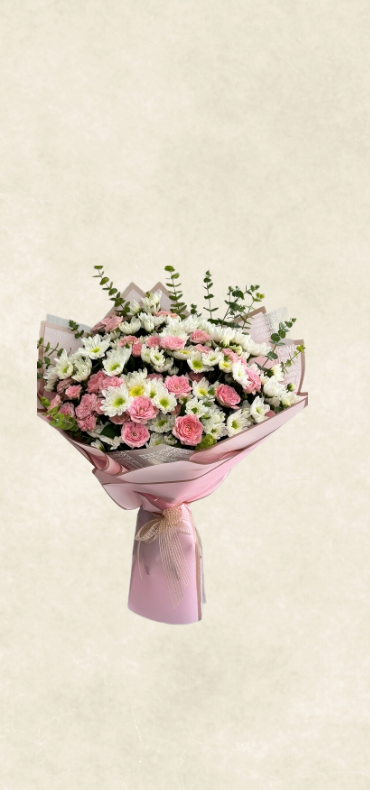 Özenle seçilmiş pembe sprey güller ve papatyalar, buket formunda şık bir ambalaj ve zarif süslemelerle hazırlanır. Özel günler, kutlamalar ve anlamlı anlar için güçlü ve klasik bir tercih sunar.