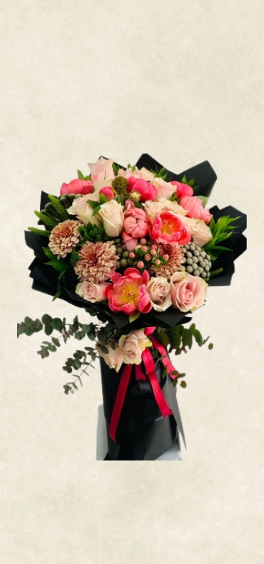 Özenle seçilmiş güller ve şakayık, buket halinde şık bir şekilde hazırlanan ambalaj ve zarif süslemelerle hazırlanır. Özel günler, kutlamalar ve anlamlı anlar için etkileyici ve özgün bir tercih sunar.
