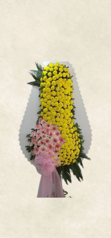 Özenle seçilmiş sarı pembe çiçekler , dekoratif ve zarif süslemelerle çelenk için hazırlanır. Özel günler, kutlamalar ve anlamlı anlar için etkileyici ve özgün bir tercih sunar.