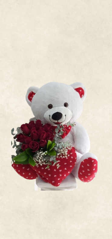 Özenle seçilmiş kırmızı güller ve beyaz ayıcık şık bir şekilde düzenlenir ve zarif süslemelerle hazırlanır. Özel günler, kutlamalar ve anlamlı anlar için romantik ve şık bir tercih sunar.