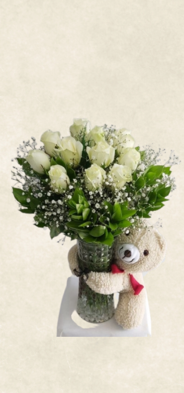 Vazo içerisinde 11 adet beyaz gül ve sevimli bir ayıcık ile hazırlanmış bu özel aranjman, hem şık hem de sevdiklerinize tatlı bir sürpriz sunar.