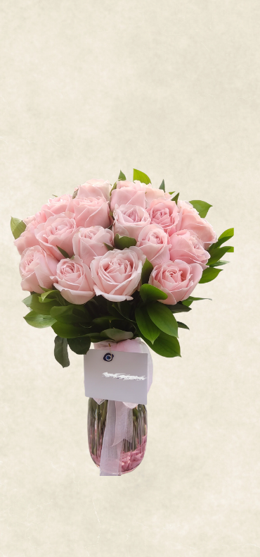 Özenle seçilmiş ithal pembe güller, vazoda şık bir şekilde düzenlenir ve zarif süslemelerle hazırlanır. Özel günler, kutlamalar ve anlamlı anlar için romantik ve şık bir tercih sunar.
