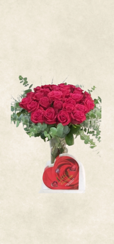 Şık bir vazoda özenle hazırlanan 21 adet kırmızı gül, kalpli çikolata detayıyla birlikte romantik ve güçlü bir sunum oluşturur. Özel günlerde duygularınızı zarif bir şekilde ifade etmek için ideal bir tercihtir.