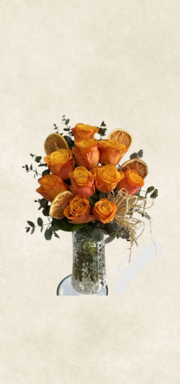 + Free ShippingVazoda düzenlenmiş ithal turuncu güllerle hazırlanan, şık ve renkli bir çiçek aranjmanı.