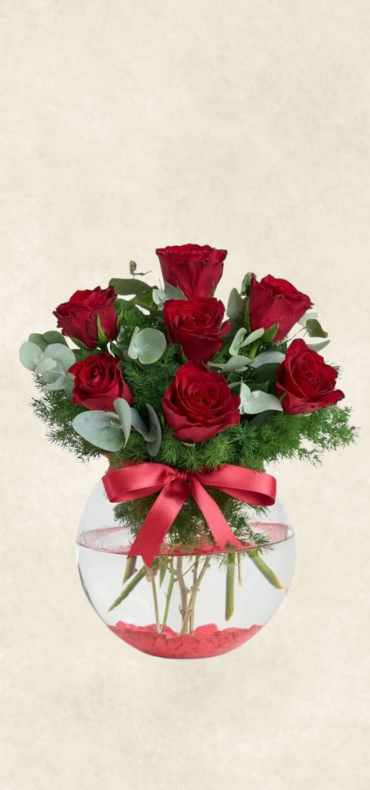 Yaklaşık 30 – 35 cm yüksekliğinde cam vazo içerisinde 7 adet taze kırmızı gül ve dekoratif yeşillikler bulunmaktadır. Masa ve yaşam alanları için zarif bir tasarımdır.